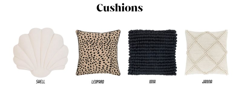 As for the cushions, I wanted to still keep it monochromatic but add quite a bit of texture and some statement pieces like the leopard print and how could I not add this beautiful shell cushion, am I right?